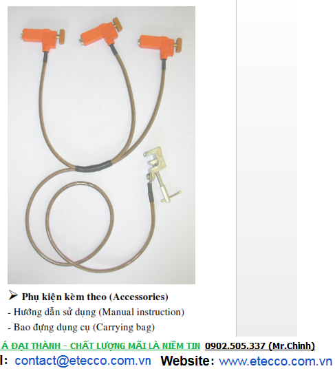 | Kết cấu | - Có 4 đoạn dây, trong đó 3 đoạn nối 3 đầu kẹp cho 3 pha mỗi đoạn dài 0,4m, đoạn còn lại nối với đầu kẹp trung tính dài 1,5m, 4 đoạn dây được nối chung 1 điểm bằng khối đồng đúc có bọc cách điện.- Dây tiếp đất là loại dây đồng mềm nhiều sợi được bọc kín bằng lớp cách điện không cho hơi nước lọt vào, chiều dầy lớp bọc cách điện là 1mm, tiết diện dây chưa bọc là 16 mm2. |